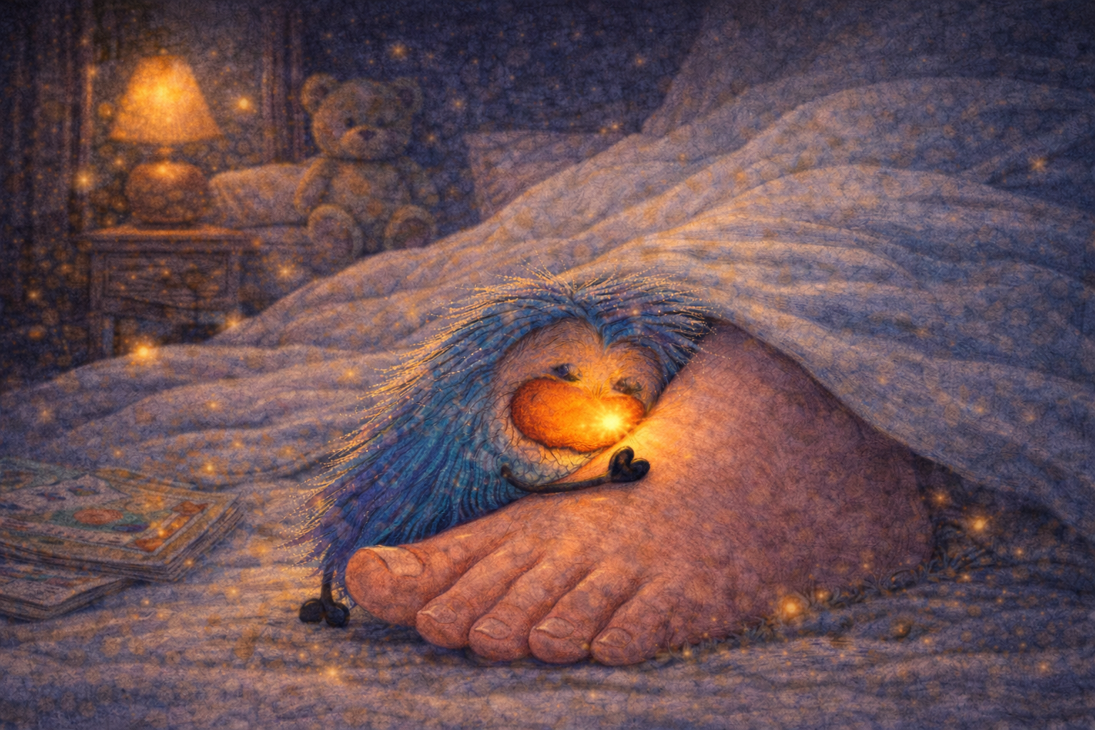 We’re magical creatures that come awake each night. Our fuzzy bodies, heart shaped hands and feet, and glowing noses sniff out stinky toes to hug so we can give kids sweet dreams and energy for a new day.
